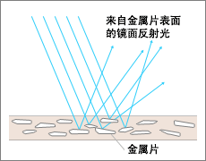 为了达到色彩绚丽的效果,许多涂料特别是汽车用方面涂料都使用了染色剂与金属粒薄片相混合的方法。 在金属漆中,由于金属薄片的作用,光线会向各个方向反射,虽然它们一般来说都是同方向线性排列的。 图25中表明了在金属漆中镜面反射光与漫射光是如何相互作用的。 由于有金属薄片引起的不同方向的镜面反射光的作用,使人眼看到的物体颜色也有所不同。 在一个接近金属片作用下的镜面反射光的角度观察时,我们会看到高亮度的颜色。 在一个金属薄片未影响的角度下,我们则看到了较暗的颜色。 总之,用分光测色计测量金属色时,在多角度下测量取值是很有必要和有效的。