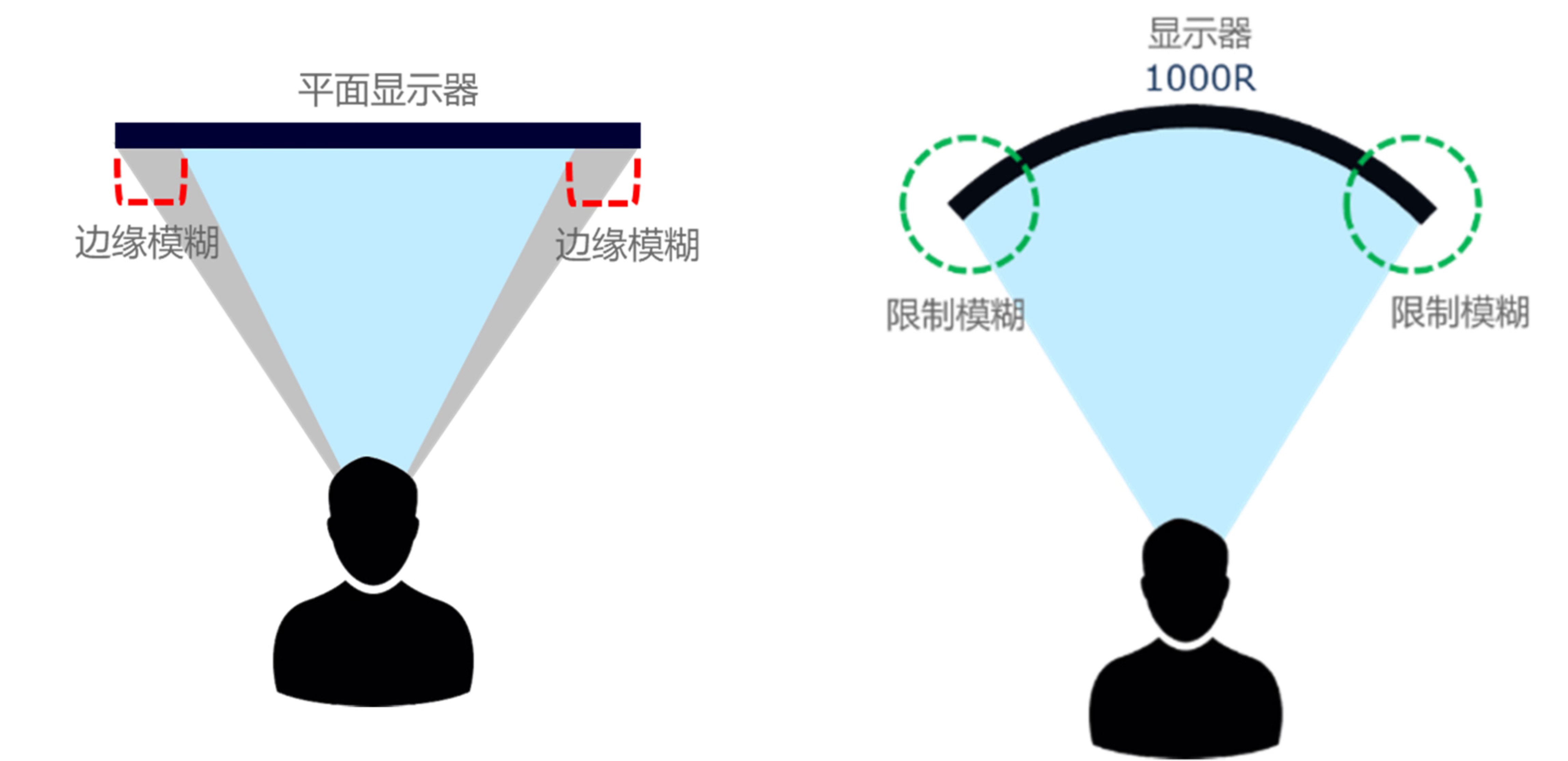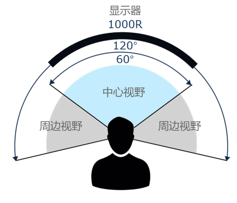 有研究表明,具有一定曲率的显示器会对使用人产生积极的影响。如果水平曲率半径高达1000mm(即1000R),可以减少眼球运动,从而减少视觉疲劳——因为这种曲线更接近人类视觉的自然曲率。