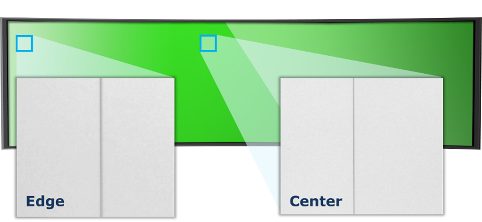 随着曲面屏的越来越多,显示行业也迎来了新的挑战。其中非常典型的就是检测曲面屏上微小的显示缺陷。我们通常使用成像系统来进行显示缺陷的检测。在成像系统对准显示器中心的情况下,从单个测量角度进行拍摄,中心的缺陷对焦良好,对比度高,提高了检测精度和可重复性。然而,如果从该对焦的角度来看曲率更大的显示器边缘,这些区域可能失焦。因此,我们可能会看到边缘上缺陷存在一些扭曲或者模糊。如下如所示,边缘的线缺陷不那么清晰,对比度较低,而且没有对焦清晰。