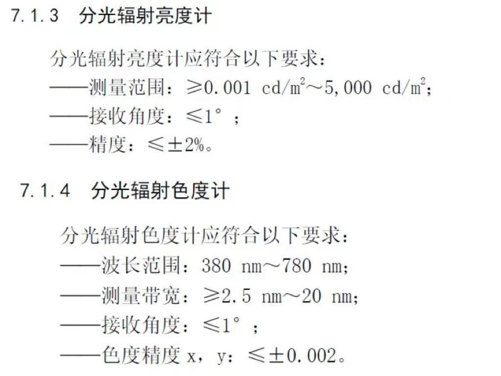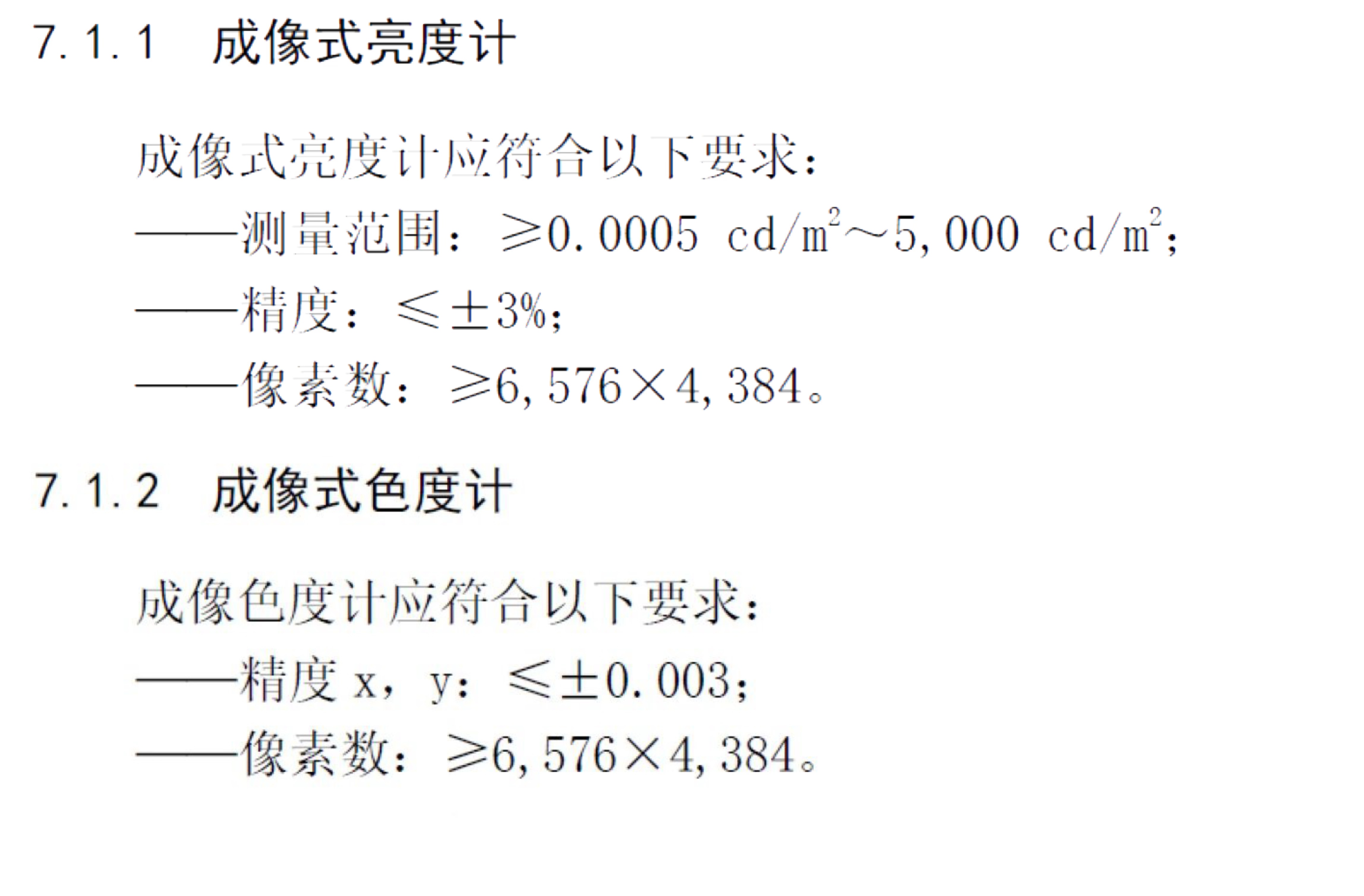成像式亮度计、成像式色度计:为保证观众观看感受上的一致性,标准中对亮度、色度的均匀性做了明确的测试要求,并指导使用成像设备进行相关测试。