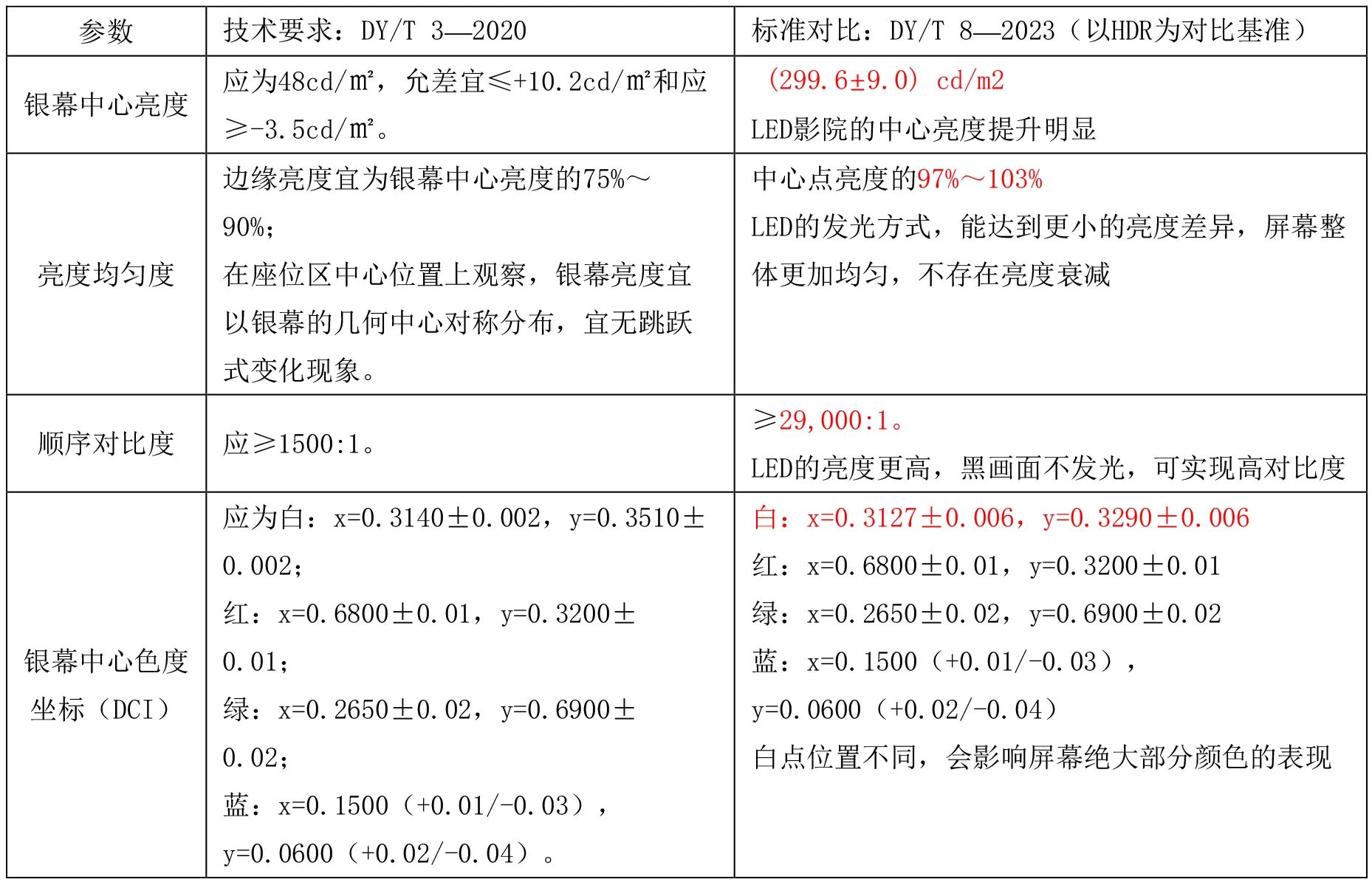 我们截取了DY/T 3—2020《数字电影巨幕影厅技术要求和测量方法》中部分测试标准,与新的LED影院标准进行了对比: