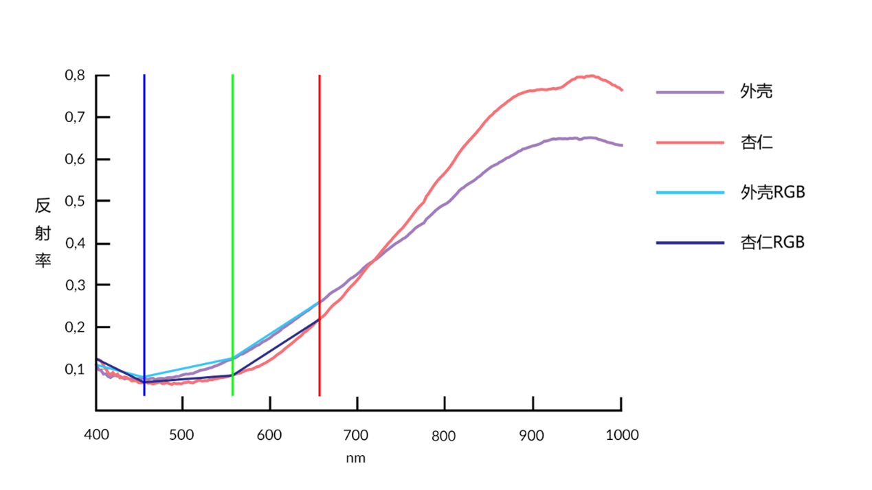 FX10;紫色)的VNIR光谱。杏仁(深蓝色)与外壳(浅蓝色)的RGB成分。