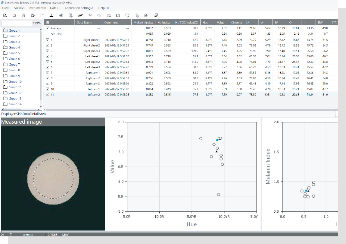 ITA°和测量条件等项目可以轻松添加或移除,让您能够根据测量项目将其整理成清晰的列表。此外,测量结果可以CSV文本格式输出,以便使用Excel®或其他电子表格应用进行进一步分析或数据管理。