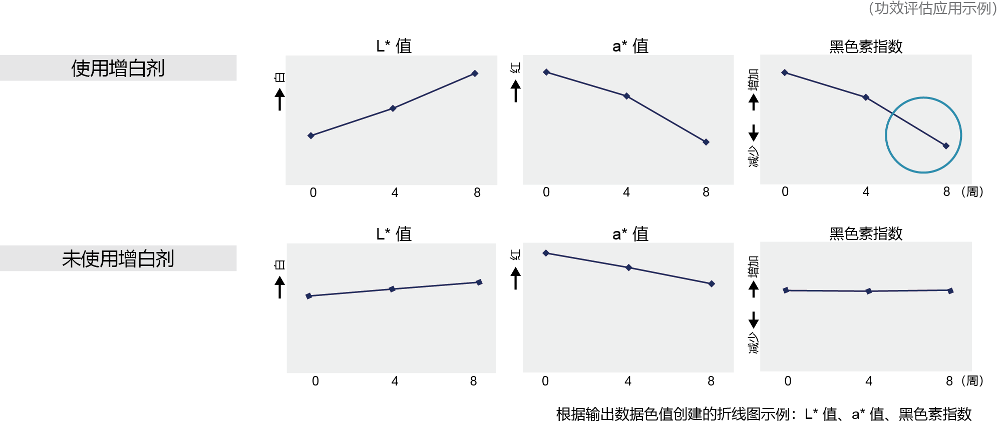 L* 值:白度增加,a* 值:红度减少。仅凭这些颜色信息无法确定增白剂的功效。