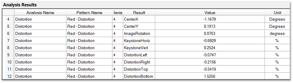 畸变测试测量多个几何失真参数,以确定图像是否出现偏离中央、旋转、梯形失真或枕形失真/桶形失真。显示并测量一个由9个点组成的图案(在3×3网格上)。软件程序将首先定位这9个点的中心位置,然后执行各点之间的测量,以确定测试是通过还是未通过。